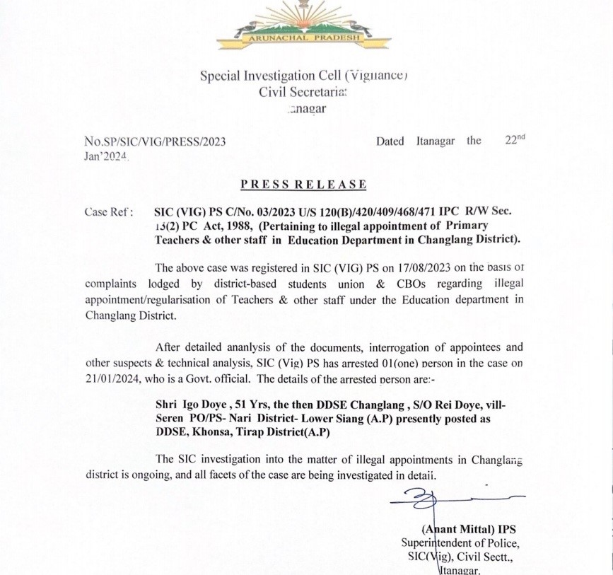 This arrest is linked to the case with CINo. 03/2023 U/S 120(B)/420/409/468/471 IPC R/W Sec. 13(2) PC Act, 1988, involving the alleged illegal appointment of primary teachers and other staff within the education department in Changlang district.