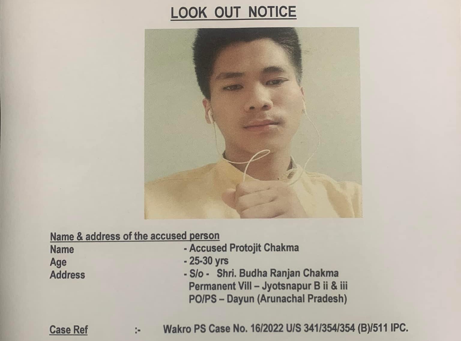 Tezu: The Lohit police have issued a look out notice against one Protojit Chakma who is allegedly on the run after molesting a woman in Lohit district.